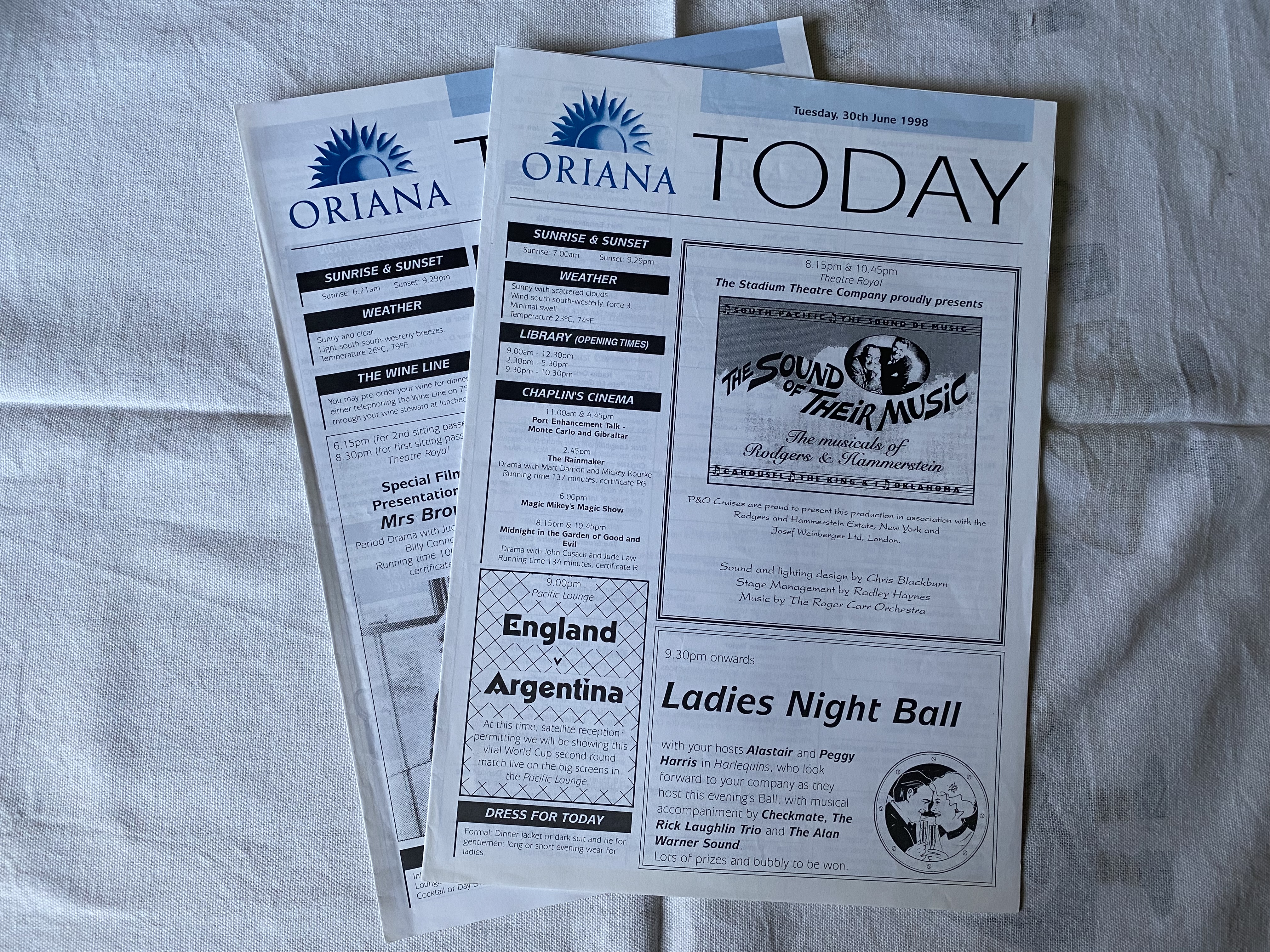 DESCRIPTION -- From the original P&O vessel the Oriana a pair of onboard daily programmes called TODAY which are from 1998 and are in an excellent condition.