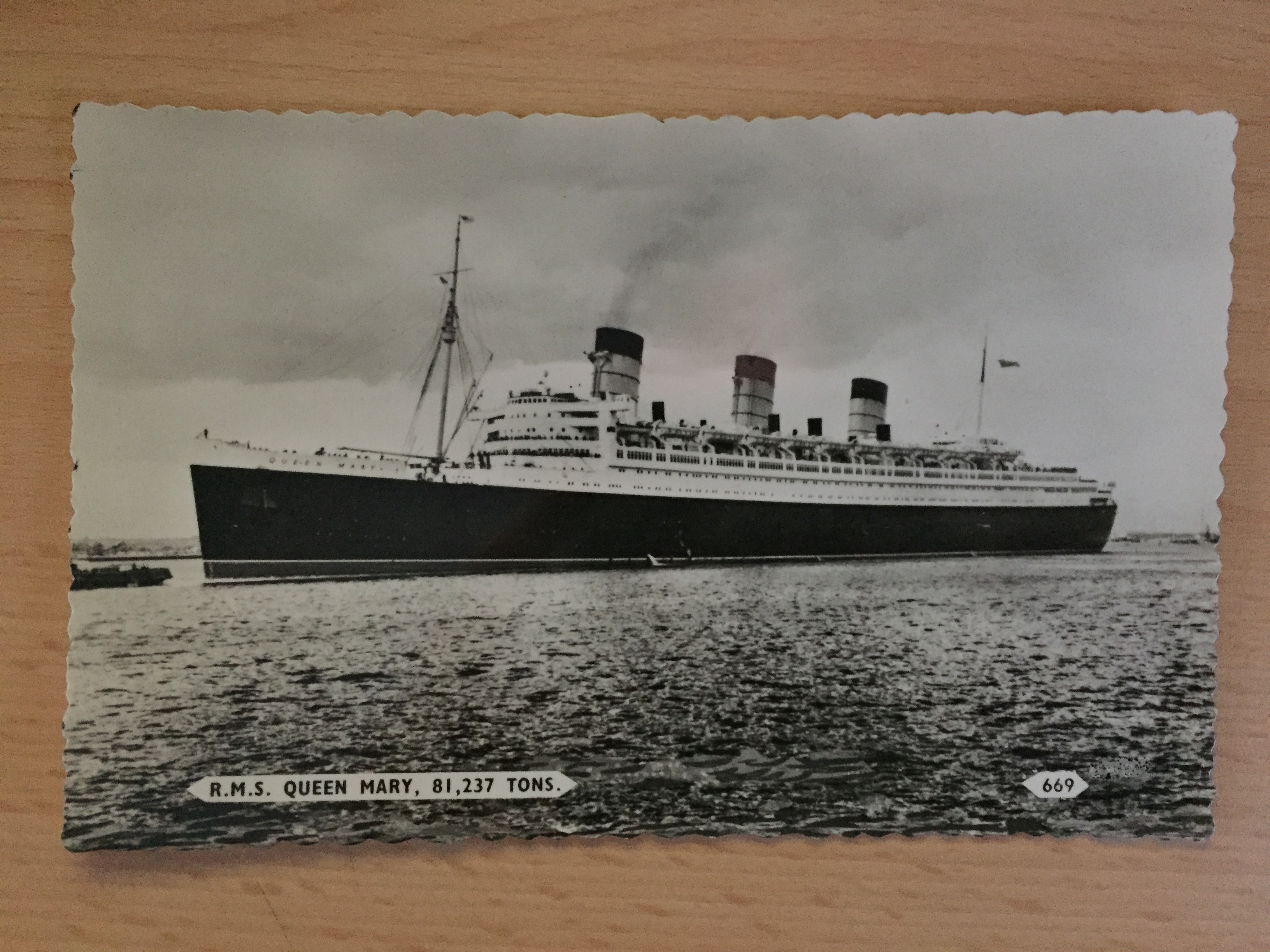 DESCRIPTION -- Early B/W postcard of the old Cunard Line vessel the RMS Queen Mary and the postcard is taken from our collection of over 2000 shipping postcards and is dated as being taken in the early 1960's.