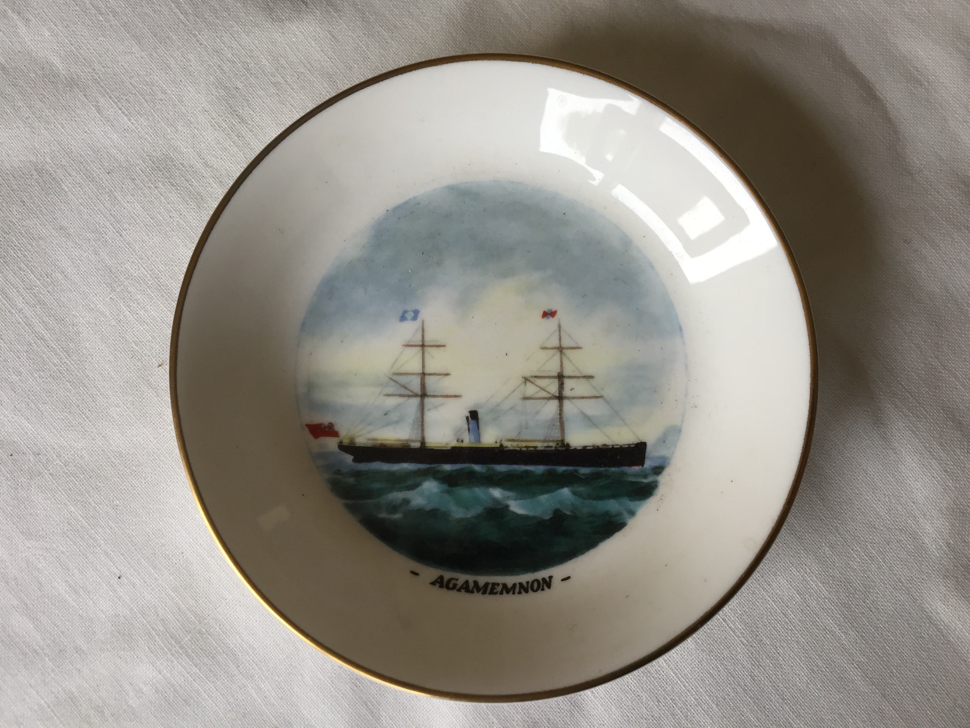 DESCRIPTION -- Superb rare to find souvenir dish from the vessel the Agamemnon of the Blue Funnel Line, showing the vessel and name in the centre and the size is 4" (10cm) wide and it is in an excellent condition.