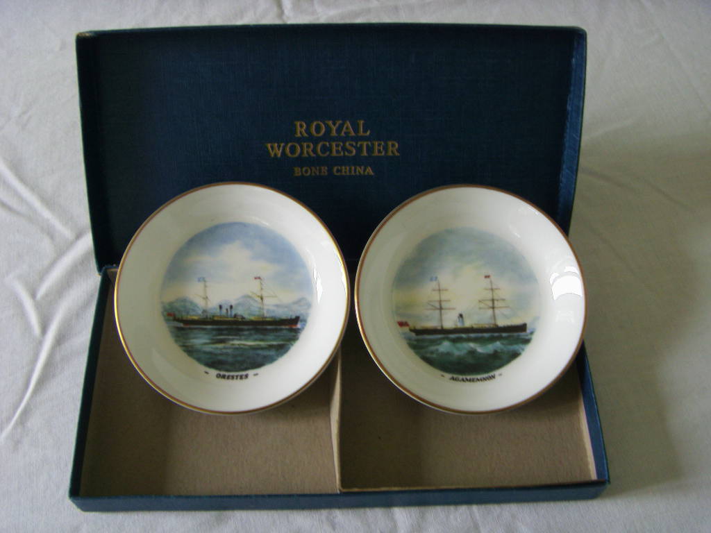 DESCRIPTION -- Pair of souvenir Royal Worcester display dishes showing a maritime theme on each and the Blue Funnel Line vessels the Orestes and the Agamemnon. They are presented in a presentation box and are in a fantastic condition.